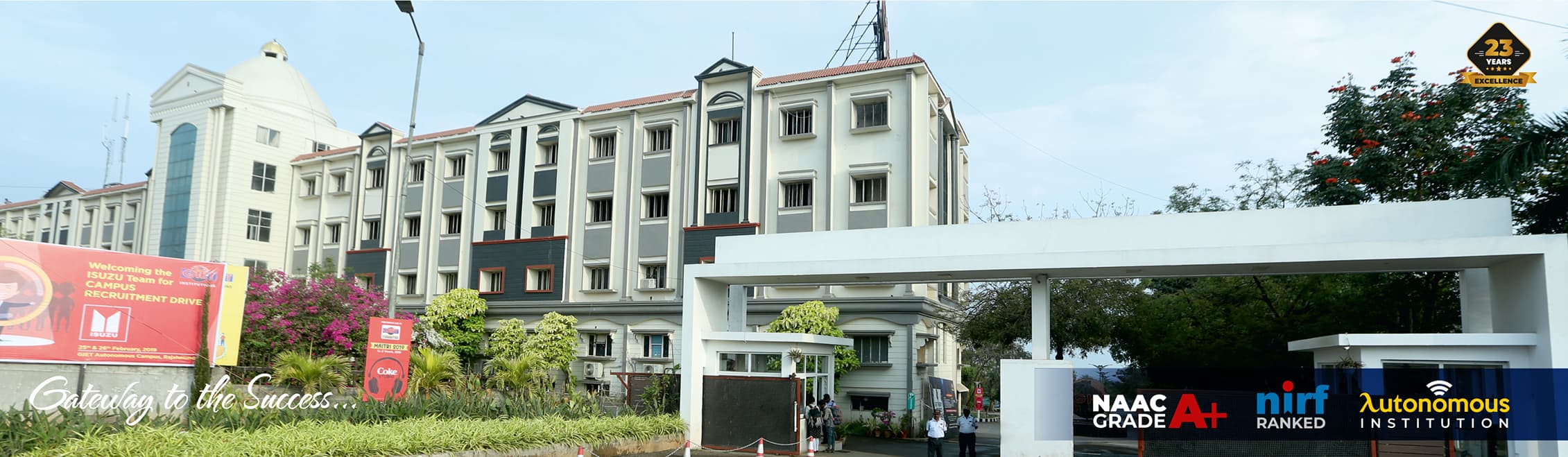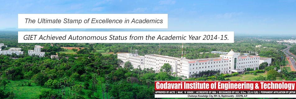 Godavari Institute of Engineering & Technology (GIET) was established in 1998 to offer engineering education of world-class standards. Over the years, the college has come a long way to gain a place of repute and a preferred destination for quality engineering education. Located in the serene and sylvan suburbs of Chaitanya Nagar, Rajahmundry on NH-16, the sprawling 300-acre campus of GIET campus reflects the finest educational facilities around. The stately 5-storeyed structure set amid idyllic setting ensures a most congenial atmosphere for scholastic pursuit in right earnest. An ISO-certified,NBA-accredited and NAAC-A Grade accredited institution, GIET has many distinctions to its credit.